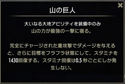 - スキルスロットに「大いなる大地」がある状態で、敵に完全にチャージした重攻撃を与える