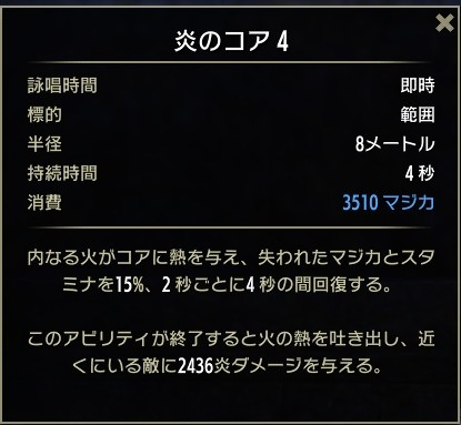 - 「熾烈なる炎スキル:炎のコア」を詠唱してマジカとスタミナを回復