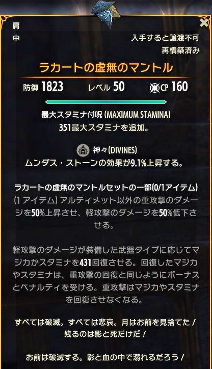 - デメリット:臆病(弱):武器ダメージと呪文ダメージが 215 低下する