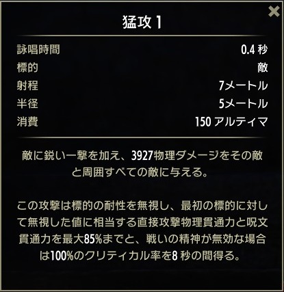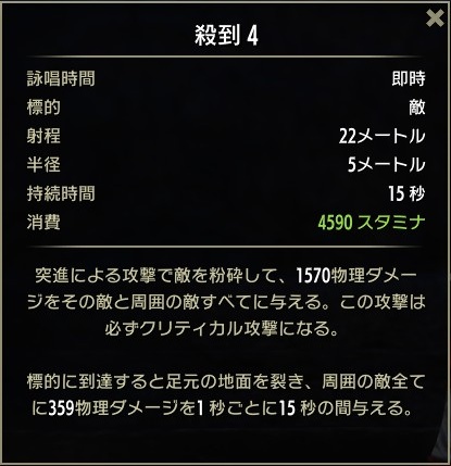 - 敵1体を対象にし、対象とその周囲5m以内の敵に物理属性ダメージを与える