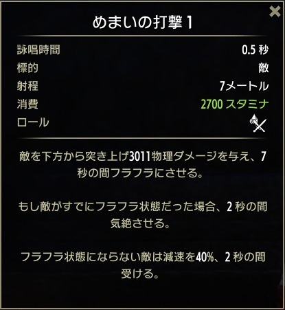 - 敵がすでに フラフラ状態 だった場合、2秒間 気絶させる
