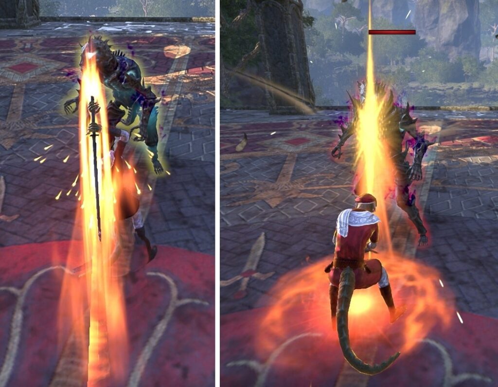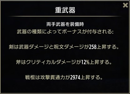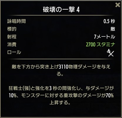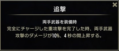 - 両手武器で完全にチャージした重攻撃を与えると、4秒間与ダメージが上昇する