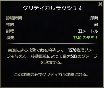 - 対象までの距離が遠ければ遠いほど、「クリティカルラッシュ」のダメージ量が上昇する