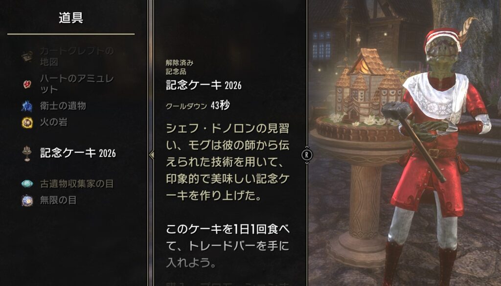 メニューを開いて「コレクション」→「道具」→「記念ケーキ2026」